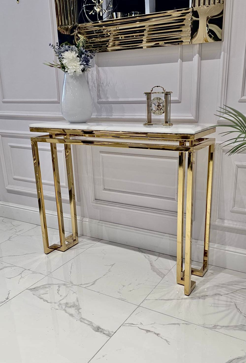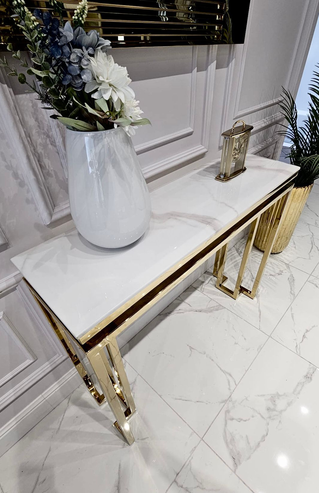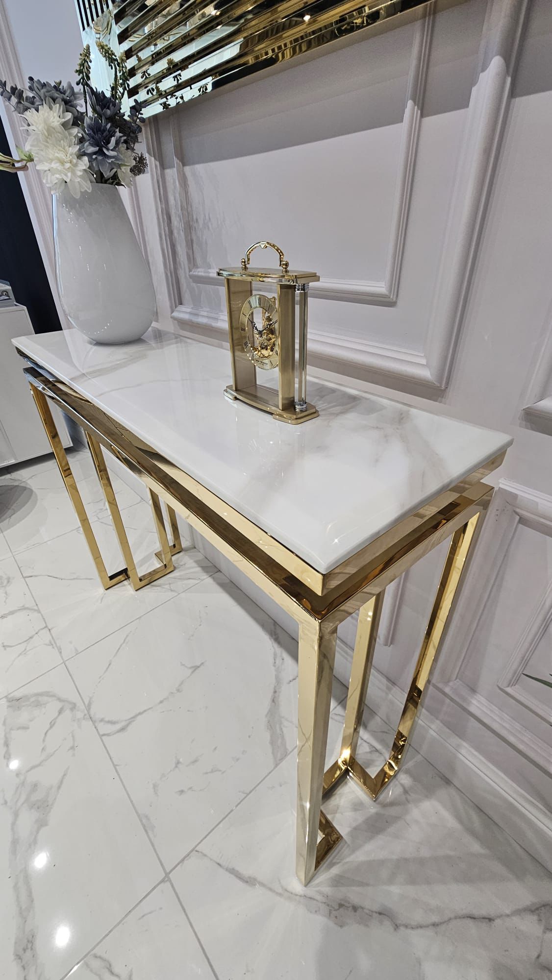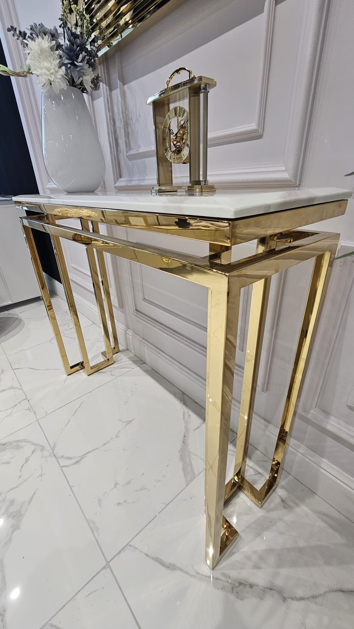 Konsola została wykonana z najwyższej jakości materiałów, co zapewnia jej trwałość i elegancki wygląd na lata. Biały blat imitujący marmur jest odporny na zarysowania oraz zabrudzenia, dzięki czemu jest łatwy w pielęgnacji i utrzymaniu. Solidny, złoty stelaż dodaje stabilności konstrukcji, a jego połyskujące wykończenie podkreśla luksusowy charakter konsoli.