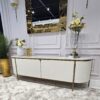 Stelaż krzesła oparty jest na smukłych, metalowych nogach w błyszczącym, złotym wykończeniu, które dodają konstrukcji lekkości i nowoczesnego blasku. Charakterystycznym akcentem jest dekoracyjny uchwyt w kolorze złota umieszczony w górnej części oparcia – nie tylko praktyczny, ale również ozdobny, podkreślający designerski charakter mebla. Zastosowane materiały są trwałe i łatwe do utrzymania w czystości, co czyni krzesło nie tylko pięknym, ale i funkcjonalnym elementem wyposażenia. Model ten doskonale odnajdzie się w eleganckich jadalniach, salonach z nutą glamour czy nowoczesnych apartamentach inspirowanych stylem boutique. Świetnie komponuje się z marmurowymi lub szklanymi stołami oraz dodatkami w złotym wykończeniu. Krzesło jadalniane na złotych nogach to idealny wybór dla osób poszukujących mebla, który łączy komfort siedzenia z dekoracyjną formą. Wymiary krzesła jadalnianego (Sz. x Gł. x W.):