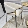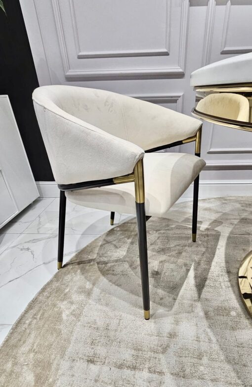 Krzesło na czarno-złotych nogach łączy w sobie luksusowy charakter i perfekcyjne rzemiosło. Złote elementy dodają mu blasku, a każdy detal został dopracowany z wyjątkową starannością. Tapicerka z miękkiego beżowego velvetu wprowadza przytulną elegancję oraz gwarantuje trwałość. To unikalny mebel, który łączy estetykę z funkcjonalnością.