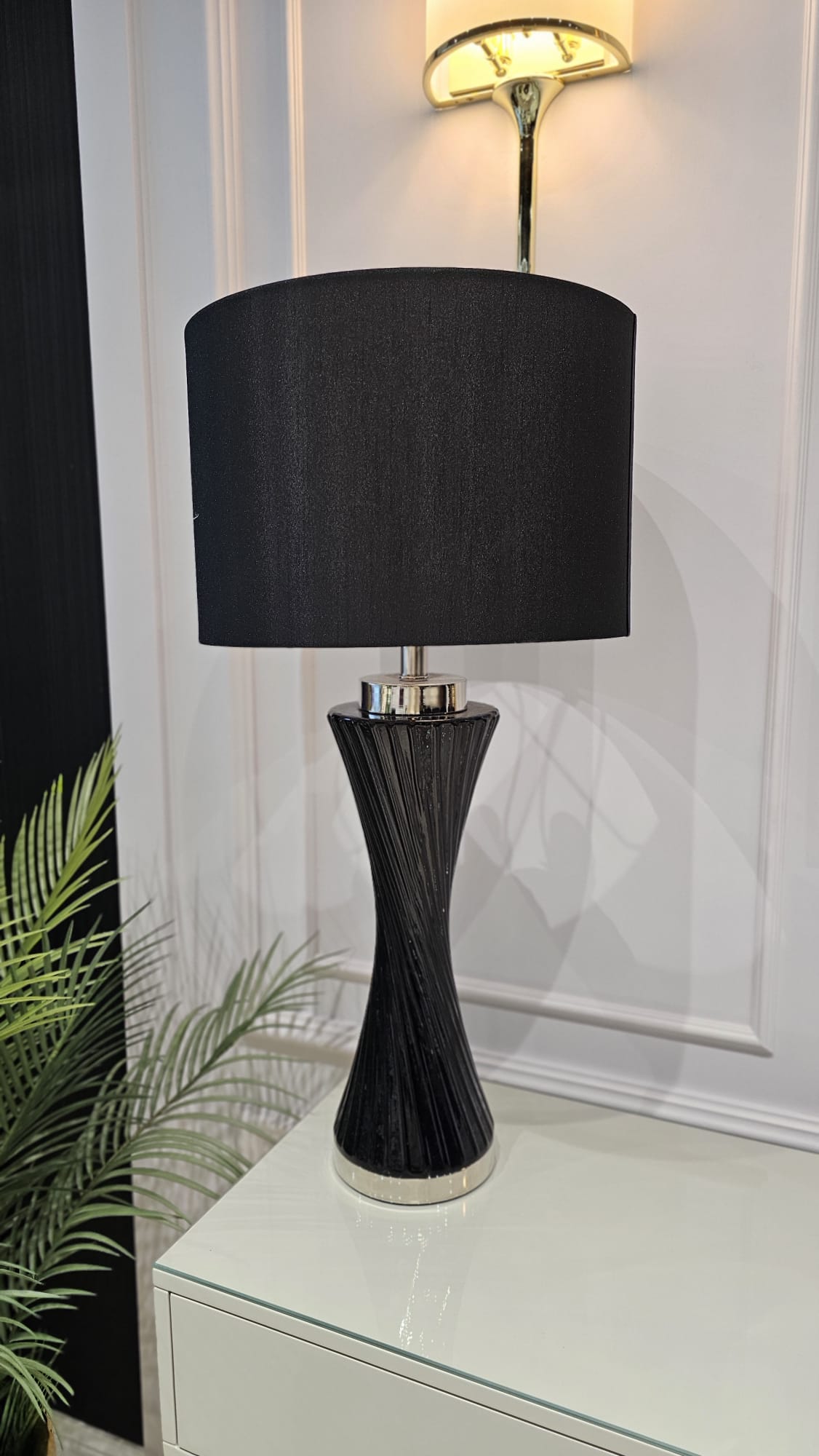 Lampa stołowa została wykonana z wysokiej jakości szkła, co zapewnia jej trwałość oraz estetyczny wygląd na długie lata. Szary abażur wykonany z miękkiej tkaniny dodaje elegancji i pozwala na przyjemne, nierażące oświetlenie. Solidna konstrukcja i staranne wykończenie sprawiają, że jest to nie tylko praktyczny element wyposażenia, ale i designerska dekoracja. Dzięki swojemu ponadczasowemu wzornictwu lampa stołowa świetnie wpisuje się w nowoczesne i eleganckie wnętrza. Idealnie sprawdzi się w salonie, sypialni czy gabinecie, nadając pomieszczeniom wyrafinowanego charakteru. Ta lampa stołowa z czarną podstawą doskonale komponuje się zarówno z minimalistycznymi aranżacjami, jak i wnętrzami w stylu modern classic czy glamour. Wymiary lampy stołowej (Śr. x W.): 35,5 x 70 cm
