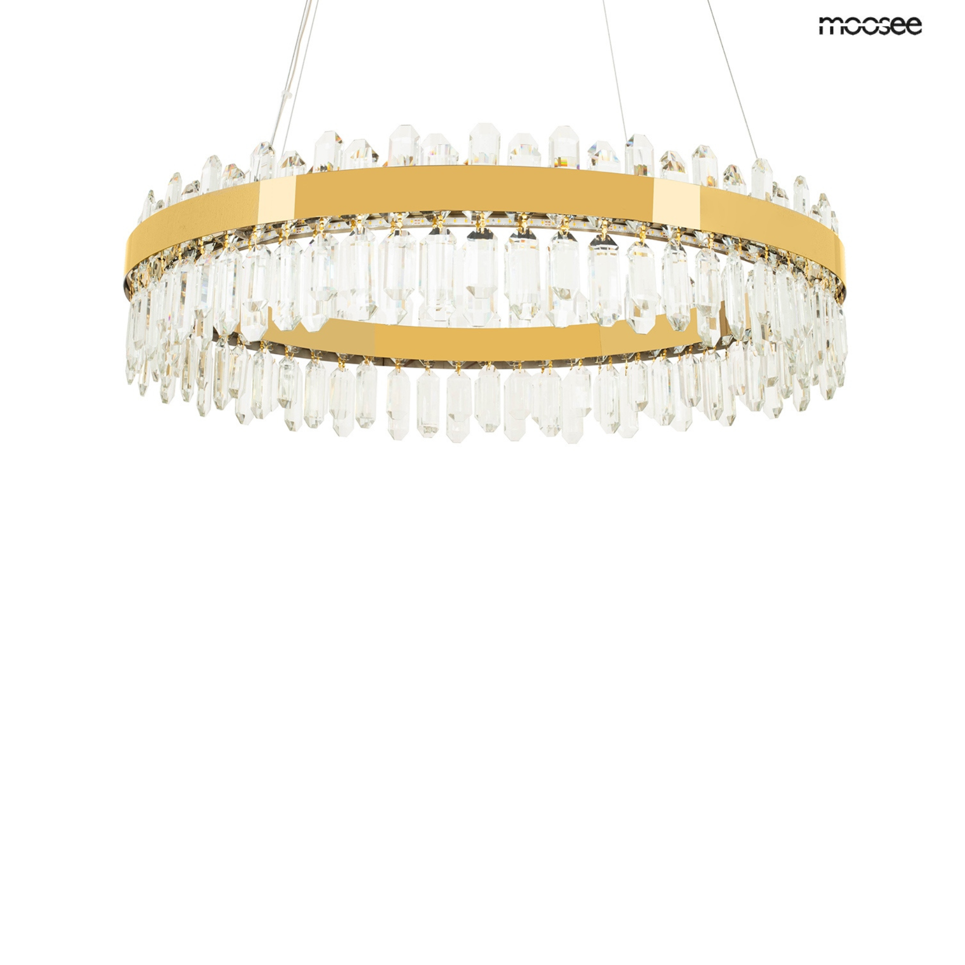Lampa wisząca została starannie wykonana z wysokiej jakości stali w złotym kolorze, co zapewnia jej trwałość i elegancki wygląd. Piękne, błyszczące kryształy precyzyjnie zamocowane na obręczy tworzą niesamowity efekt wizualny, odbijając i rozpraszając światło. Regulowane cienkie linki umożliwiają dostosowanie wysokości oraz kąta nachylenia lampy, co gwarantuje jej funkcjonalność i wszechstronność zastosowania. Lampa wisząca ze stalową złotą obręczą i kryształami idealnie pasuje do luksusowych salonów i jadalni, gdzie jej blask i elegancja podkreślą wyrafinowany styl wnętrza. Doskonale sprawdzi się również w nowoczesnych sypialniach, dodając im glamour i subtelnego uroku. Ponadto, będzie wyjątkowym akcentem w eleganckich hotelach i restauracjach, tworząc atmosferę luksusu i ekskluzywności. Wymiary lampy wiszącej (Śr. x W.): 100 x 220 cm