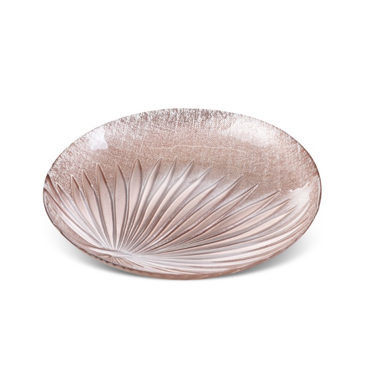 Wprowadź do swojego wnętrza odrobinę luksusu dzięki dekoracyjnej paterze ze szkła artystycznego o nowoczesnym designie. Oferujemy unikatowy produkt, który zachwyca swoim kształtem inspirowanym liściem palmowym. Patera w kolorze jasnoróżowym, dzięki swoim wymiarom (średnica 28 cm, wysokość 4 cm), doskonale sprawdzi się jako elegancka dekoracja stołu lub efektowny element wystroju.