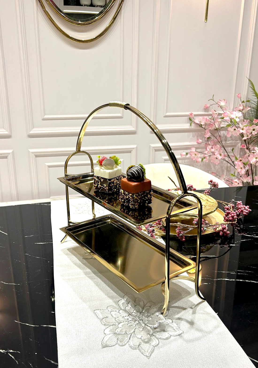 Dwupoziomowa złota patera to elegancki i klasyczny dodatek, który od razu przyciąga wzrok swoim ponadczasowym wyglądem. Jej symetryczna, harmonijna forma oraz wyważone proporcje nadają jej wyjątkowo szykowny charakter. Błyszcząca, złota powierzchnia podkreśla luksusowy styl, a delikatne detale konstrukcji sprawiają, że patera prezentuje się niezwykle dekoracyjnie i reprezentacyjnie. To efektowny element, który naturalnie podnosi estetykę stołu i wprowadza do wnętrza odrobinę eleganckiego blasku.