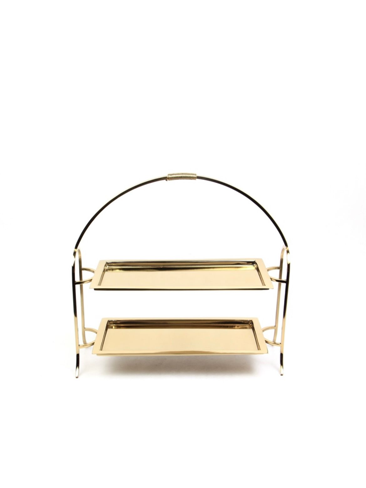 Patera została wykonana z trwałego, starannie wykończonego metalu, co gwarantuje solidność i stabilność podczas użytkowania. Jej powierzchnia jest gładka, odporna na przetarcia, a złote pokrycie zachowuje swój intensywny kolor przez długi czas. Precyzyjnie połączone elementy oraz mocny, dekoracyjny uchwyt podkreślają wysoką jakość wykonania i dbałość o każdy szczegół. Dwupoziomowa patera doskonale odnajdzie się w klasycznych, eleganckich, a także nowoczesnych wnętrzach, w których liczy się stylowy akcent. Sprawdzi się na jadalnianym stole, w salonie, podczas przyjęć, świątecznych spotkań czy popołudniowych słodkich poczęstunków. Idealna do serwowania owoców, deserów czy drobnych przekąsek, jednocześnie pełni funkcję dekoracyjną. Jej złoty kolor dodaje wnętrzu ciepła, luksusu i ponadczasowego charakteru. Wymiary patery (Sz. x Gł. x W.):