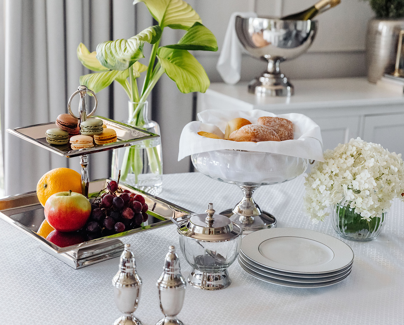 Srebrna dwupiętrowa patera sprawdzi się jako element eleganckiej zastawy na stole na przyjęciu rodzinnym czy większej uroczystości.