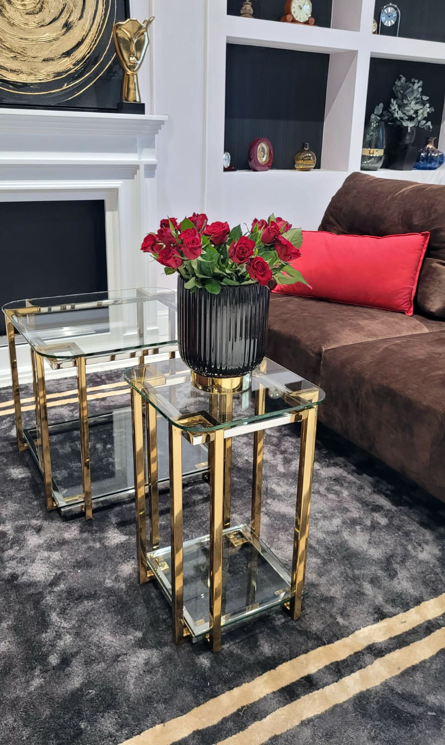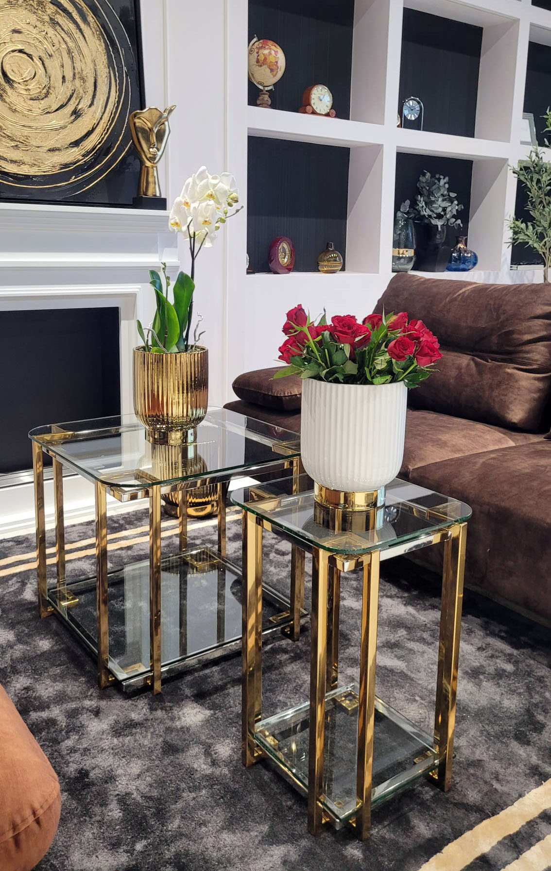 Stolik pomocniczy Elisse został wykonany z najwyższej jakości materiałów, które zapewniają trwałość i elegancję. Metalowy stelaż gwarantuje stabilność konstrukcji, a jego wykończenie jest odporne na codzienne użytkowanie. Transparentne szklane blaty cechuje gładka powierzchnia, łatwa do utrzymania w czystości, co czyni stolik zarówno praktycznym, jak i estetycznym elementem wnętrza.