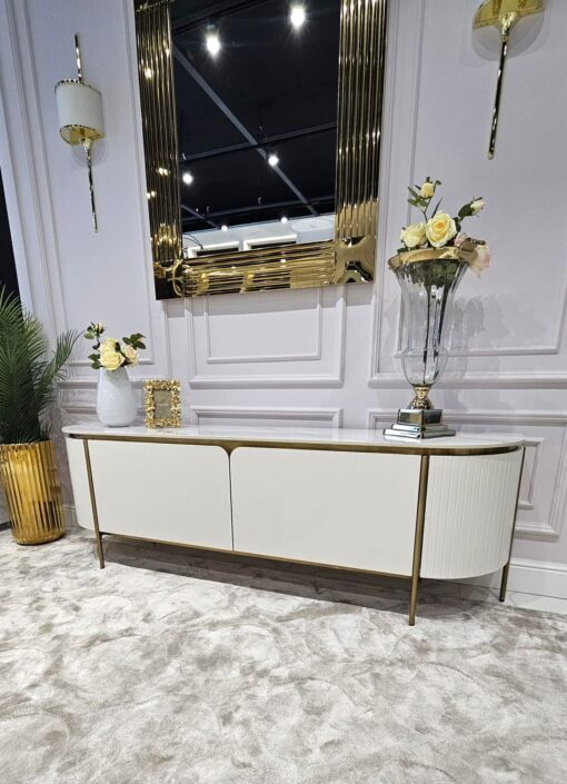 SZAFKA RTV w kolorze ecru z złotytmi, metalowymi dodatkami, blat z marmuru syntetycznego, ryflowane boki, nowoczesny glamour