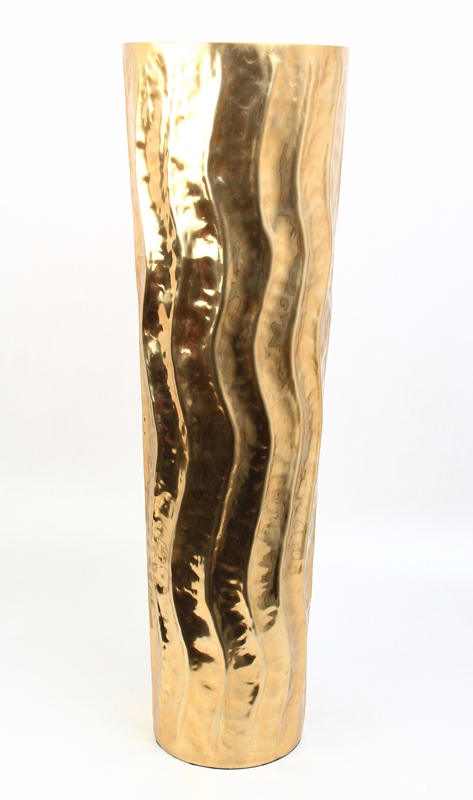 Wazon wykonany jest z solidnego aluminium, znanego ze swojej trwałości oraz odporności na uszkodzenia. Materiał pozwolił na precyzyjne odwzorowanie falistego wzoru, dzięki czemu całość prezentuje się niezwykle starannie i estetycznie. Ten dekoracyjny wazon świetnie sprawdzi się w eleganckich, nowoczesnych wnętrzach, szczególnie w aranżacjach inspirowanych stylem glamour i modern chic. Dzięki swojej wysokości i wyrazistej formie może pełnić rolę samodzielnej dekoracji w salonie, holu czy przy wejściu do domu. Doskonale prezentuje się także jako element kompozycji z wysokimi, ozdobnymi trawami lub minimalistycznymi gałązkami. Wazon dodaje przestrzeni luksusu, blasku i nowoczesnego charakteru. Wymiary wazonu (Sz. x Gł. x W.):